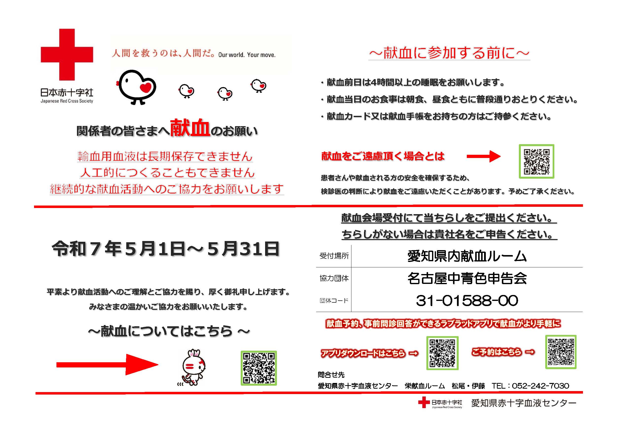 infomation2025.05.082025年5月1日~31日は献血月間 2025/5/1~5/31「献血月間」 @中区栄献⾎ルーム 団体コード:01588 協⼒団体として数字がカウントされます。 愛知県内の献血ルームならどこでもOKです。 献血のときに、青色申告会と間接的にでも関係があったり、ご家族、ご親戚でも、上記団体コードをお申し出ください。