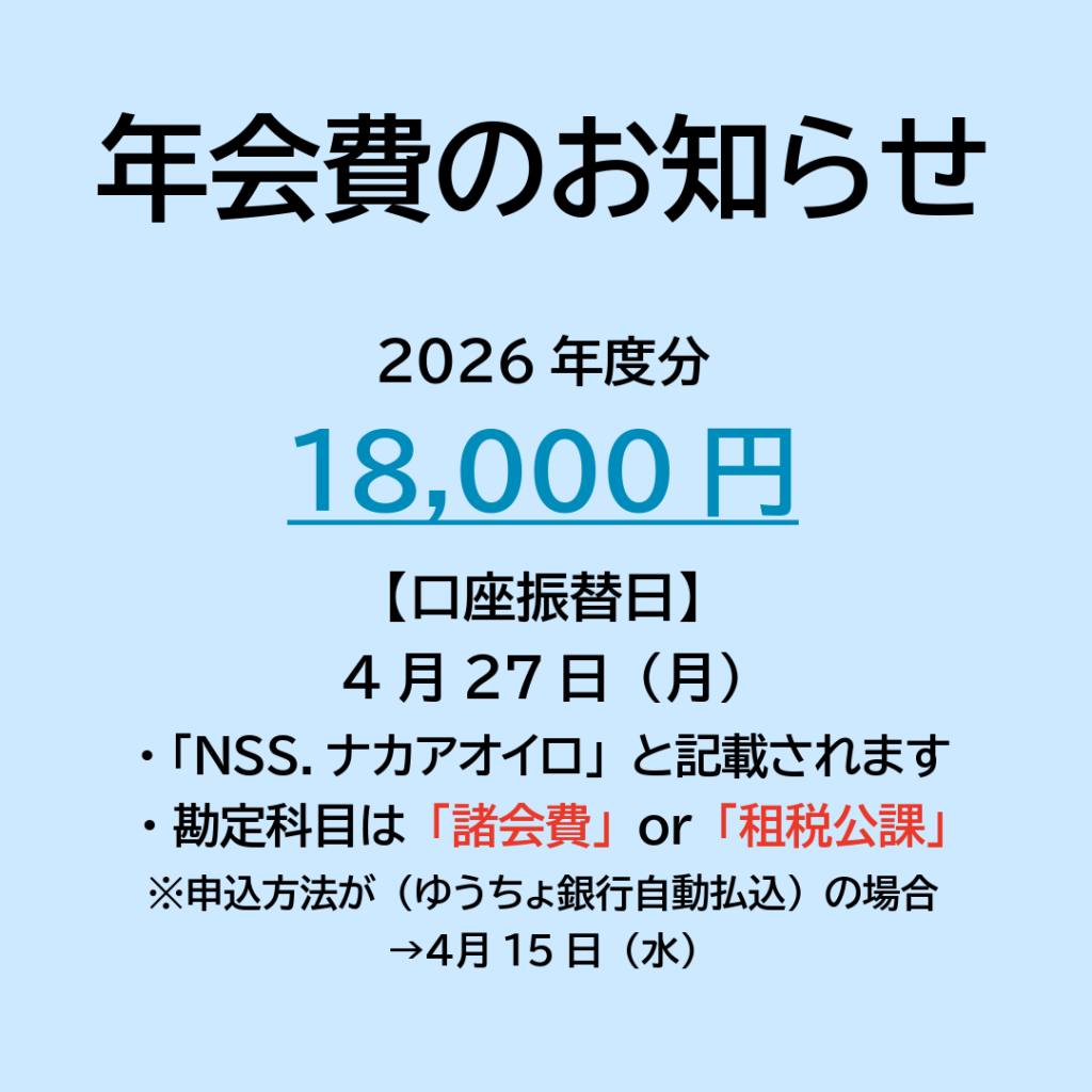 未分類2026.04.102026年度 年会費のお知らせ ・ジョブカンをお使いの方は、利用料が合算されます ・特別記帳指導料等やその他サポート料(合算の意思表示のあった方のみ)が合算されます ・「お振込みの方」には近日中に「2026年度会費の納入について」と「振込用紙」が郵送されます