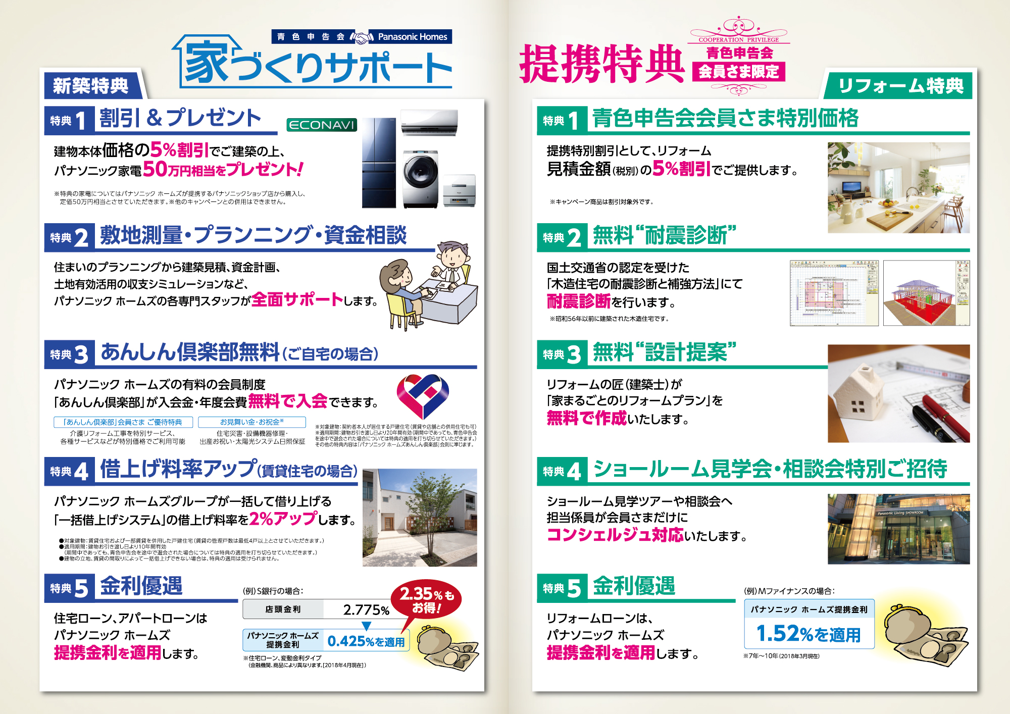 名古屋青色申告会は不動産所得の会員様が多いことから、何かお役に立てることがあるのでは、という考えから住宅建築や土地活用に豊富な実績を持つパナソニックホームズ株式会社と提携しました。下記のとおり、数多くの特典がありますので、お気軽にお尋ねください。